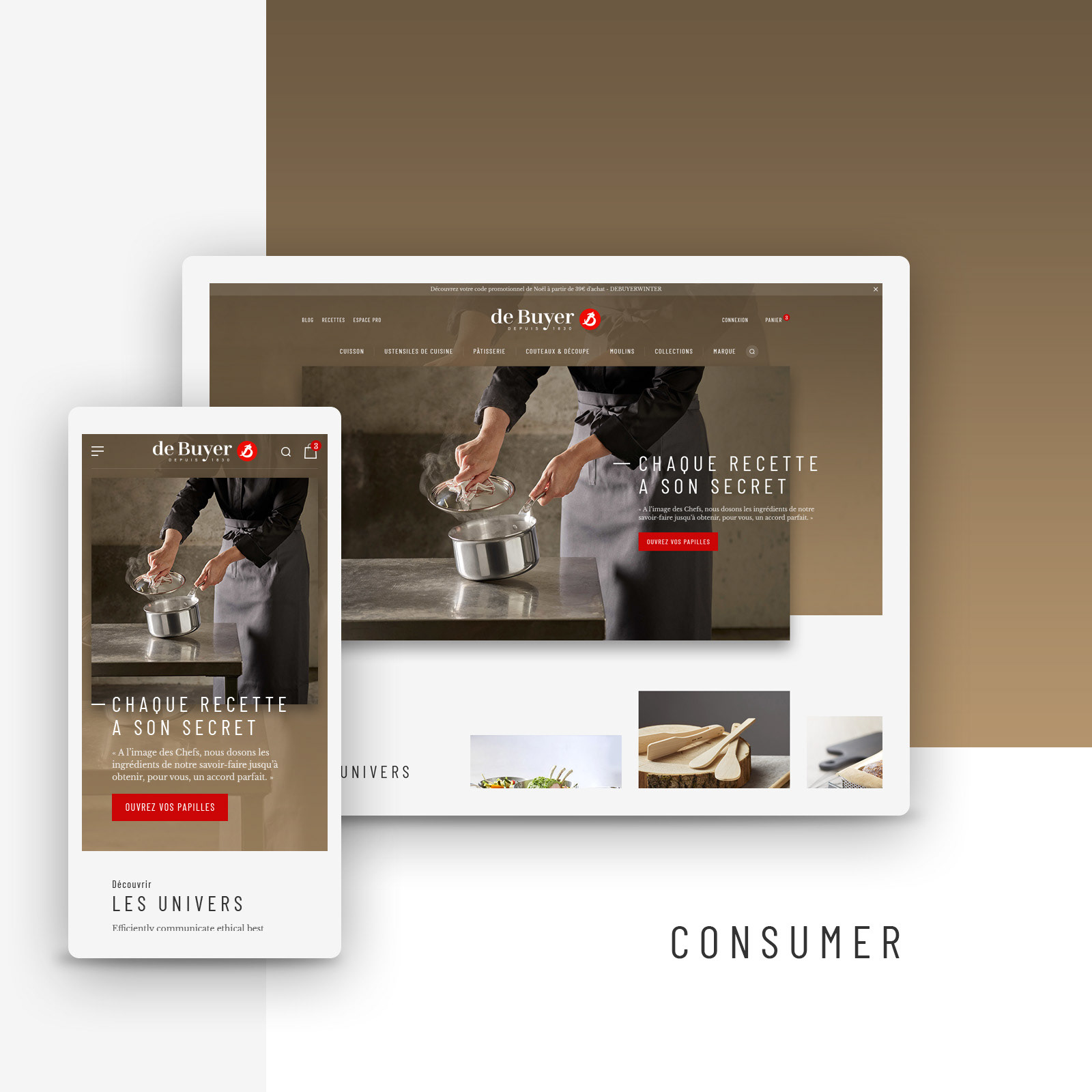 Création de la nouvelle charte graphique web et refonte e-commerce BtoB et BtoC pour de Buyer, fabricant français de matériels et ustensiles de cuisine